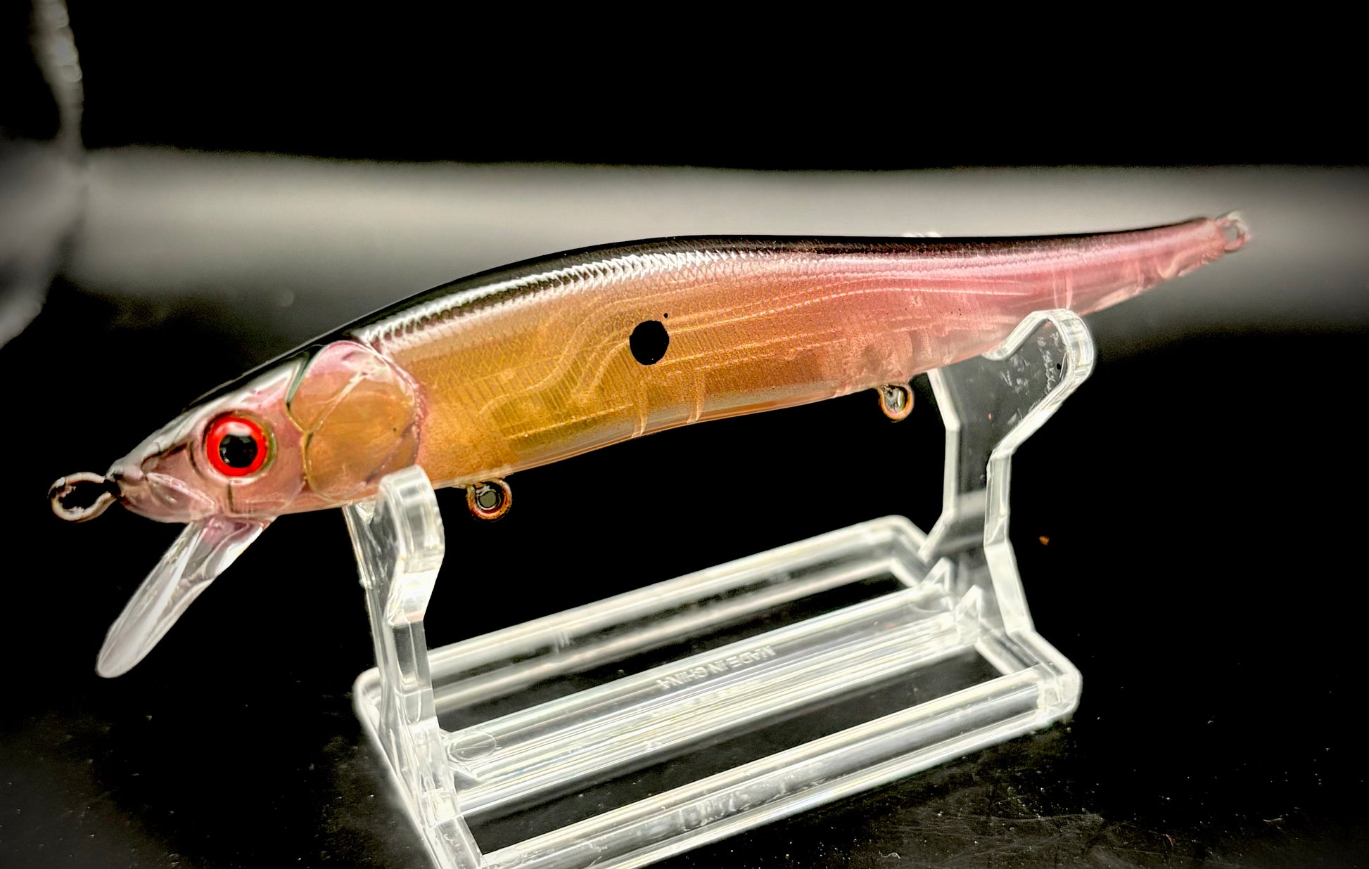 Jerkbait 110 custom painted in our one of a kind colors. Translucent, depth range 3-7ft! Size 6 Mustad Hooks!