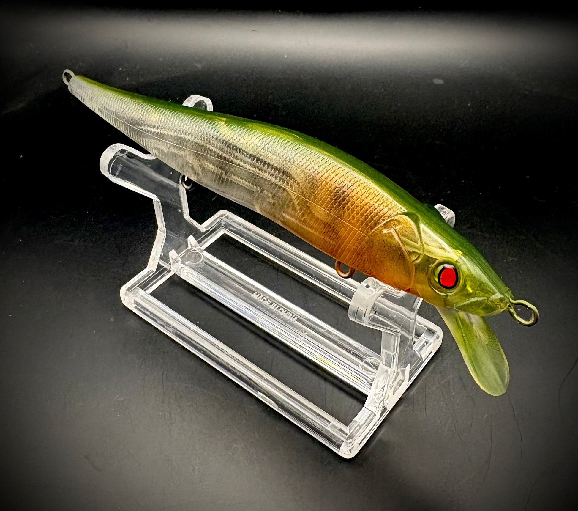 Jerkbait 110 custom painted in our one of a kind colors. Translucent, depth range 3-7ft! Size 6 Mustad Hooks!