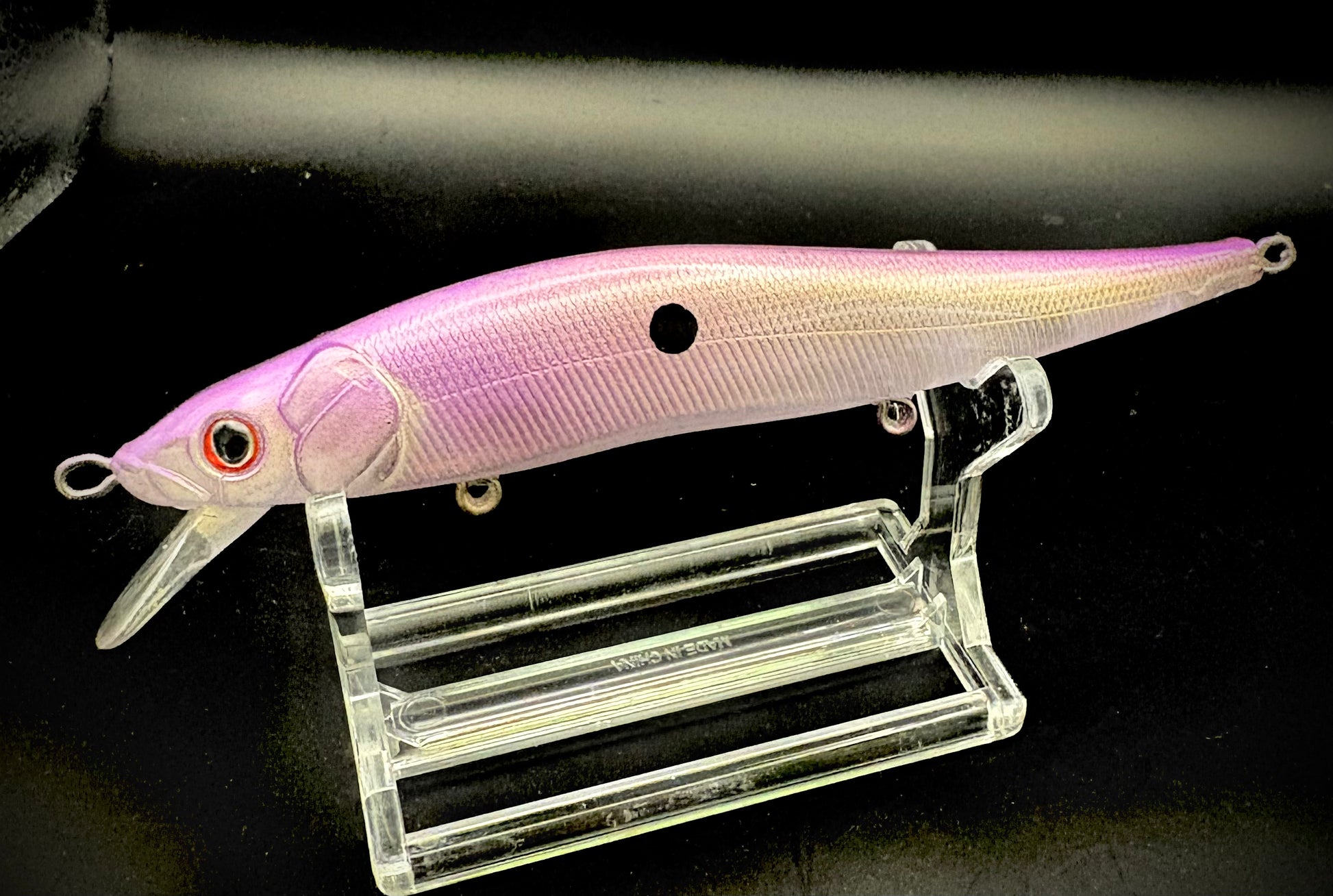 Jerkbait 110 custom painted in our one of a kind colors. Translucent, depth range 3-7ft! Size 6 Mustad Hooks!